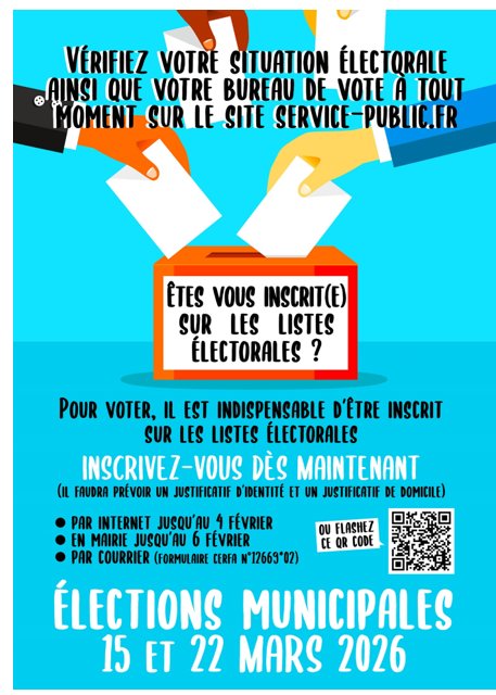– Pour les élections municipales 2026, il sera possible de s’inscrire sur les listes électorales en ligne jusqu’au 4 février 2026 et en mairie jusqu’au 6 février 2026.